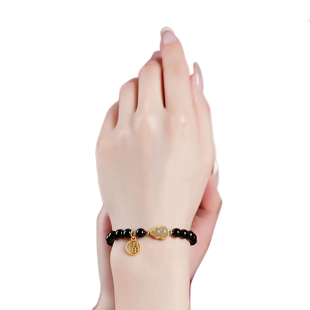 This obsidian gourd bracelet features polished black beads with gold-plated accents and a jade-like gourd pendant. The 16cm adjustable design combines traditional Chinese symbolism with modern craftsmanship, perfect for daily wear or as a meaningful gift.