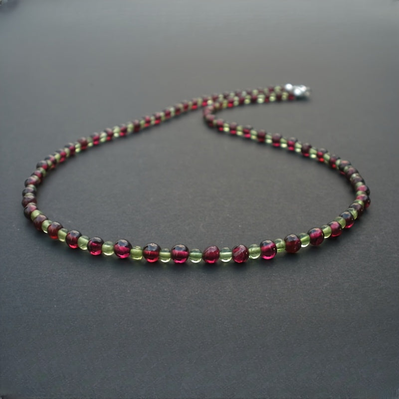 This peridot and garnet birthstone necklace features 3mm smooth beads in alternating red and green hues. The combination of peridot and garnet creates an elegant look perfect for daily wear or special occasions.