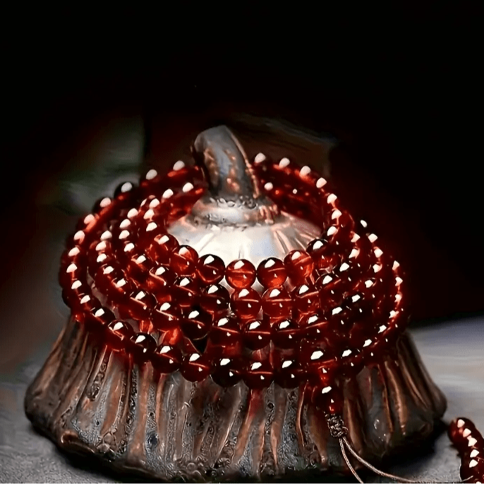 “The deep red amber beads create an elegant accessory that’s perfect for both spiritual practices and stylish daily wear.”