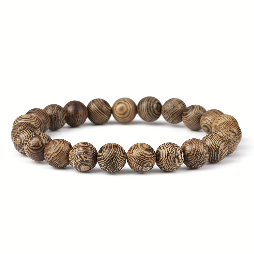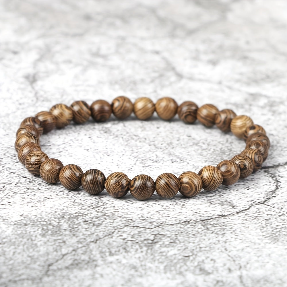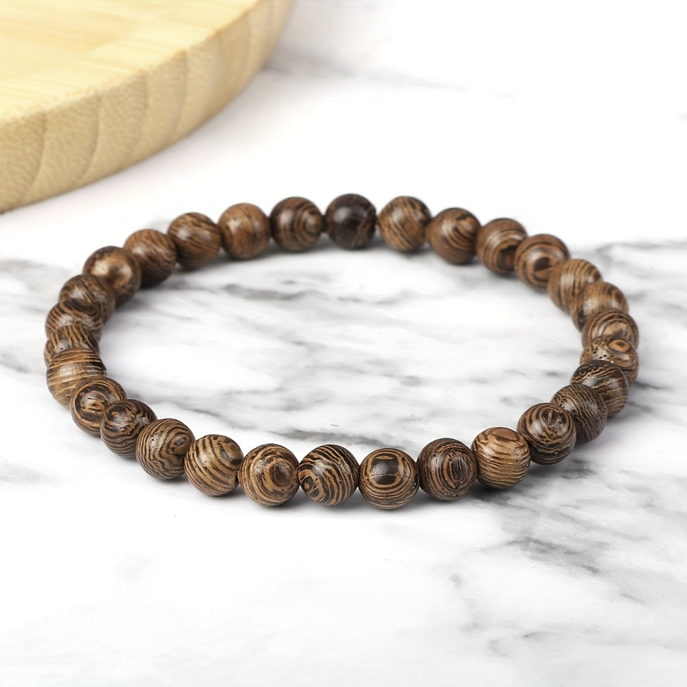This recycled wood bead bracelet features an elastic stretchy design for comfortable wear, perfect for meditation, spiritual practice, and everyday use. The natural brown hues of the wooden beads promote grounding energy and connection to nature.