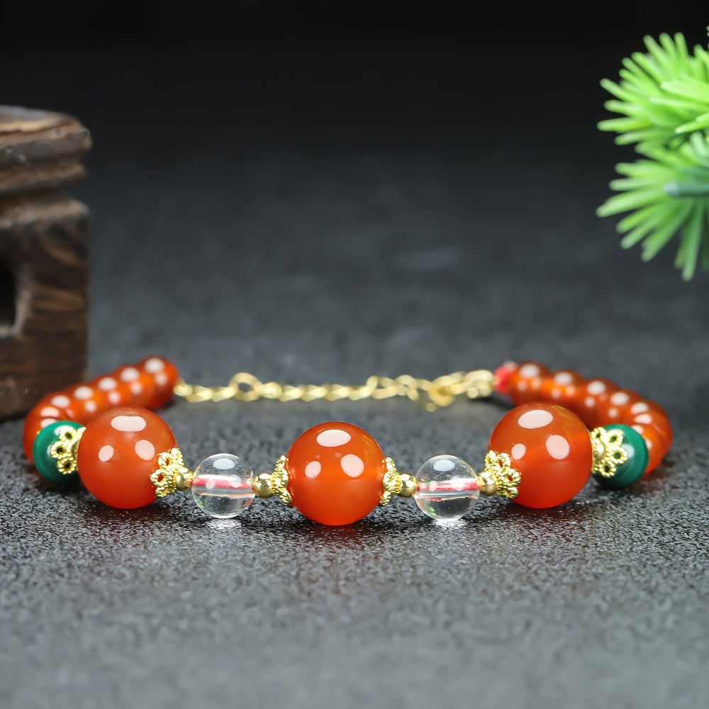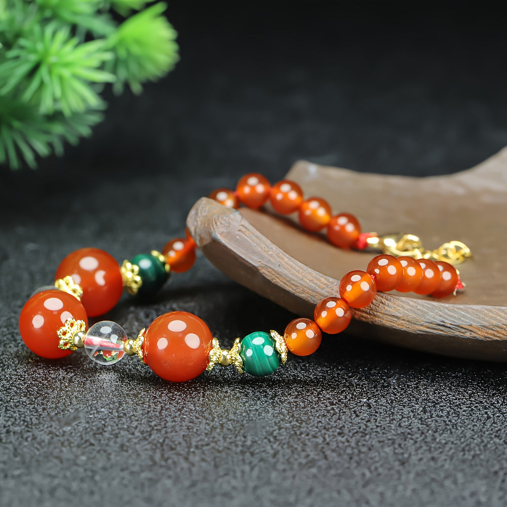 The core of this bracelet's energy comes from the Red Agate, a stone of strength and vitality. It is intrinsically linked to the Root Chakra, which governs our sense of security, survival, and physical presence in the world. This stone helps to anchor your energy, dispel fears, and build unshakeable confidence. The gold-tone spacers are not merely decorative; they channel the energy of the sun, amplifying the agate's power and attracting success and prosperity.