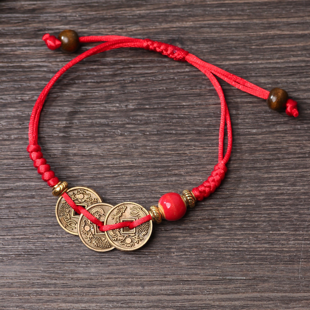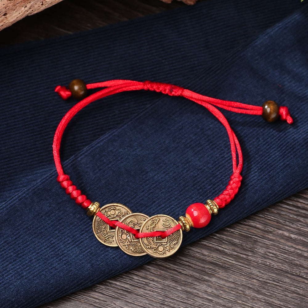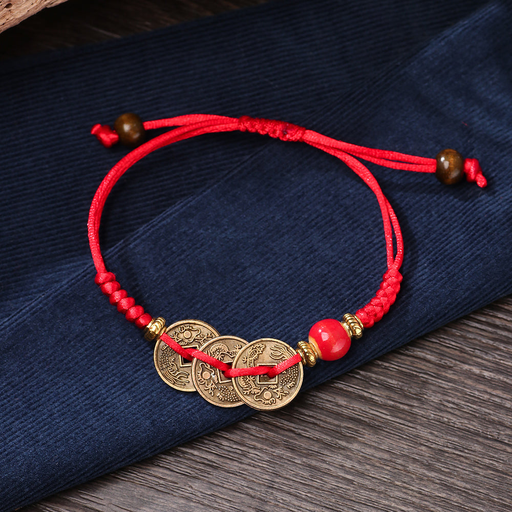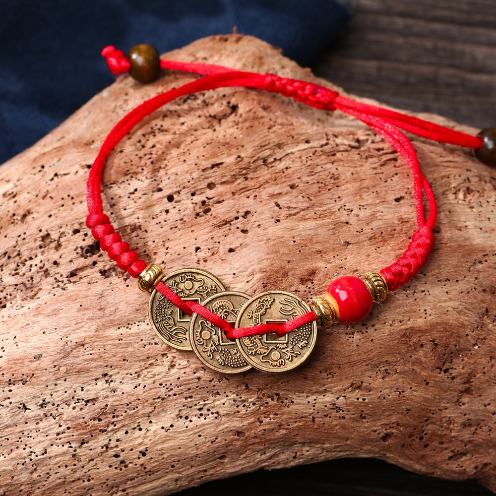 This red braided coin bracelet combines traditional Chinese symbolism with modern style. The vibrant red cord represents luck, vitality, and protection, while the antique copper coins symbolize wealth and prosperity. This makes it both a fashionable accessory and a meaningful luck attraction talisman for daily wear or special occasions.