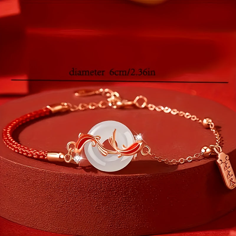 This Red Koi Fish Charm Bracelet features a delicate design with a white jade-like circular charm embraced by two red koi fish, symbolizing peace, happiness, and good fortune. The adjustable red braided cord and copper accents create a harmonious blend of traditional symbolism and modern style. Perfect as a meaningful gift for girlfriends, wives, or daughters, this bracelet is more than jewelry—it's a talisman for positive energy and spiritual harmony.