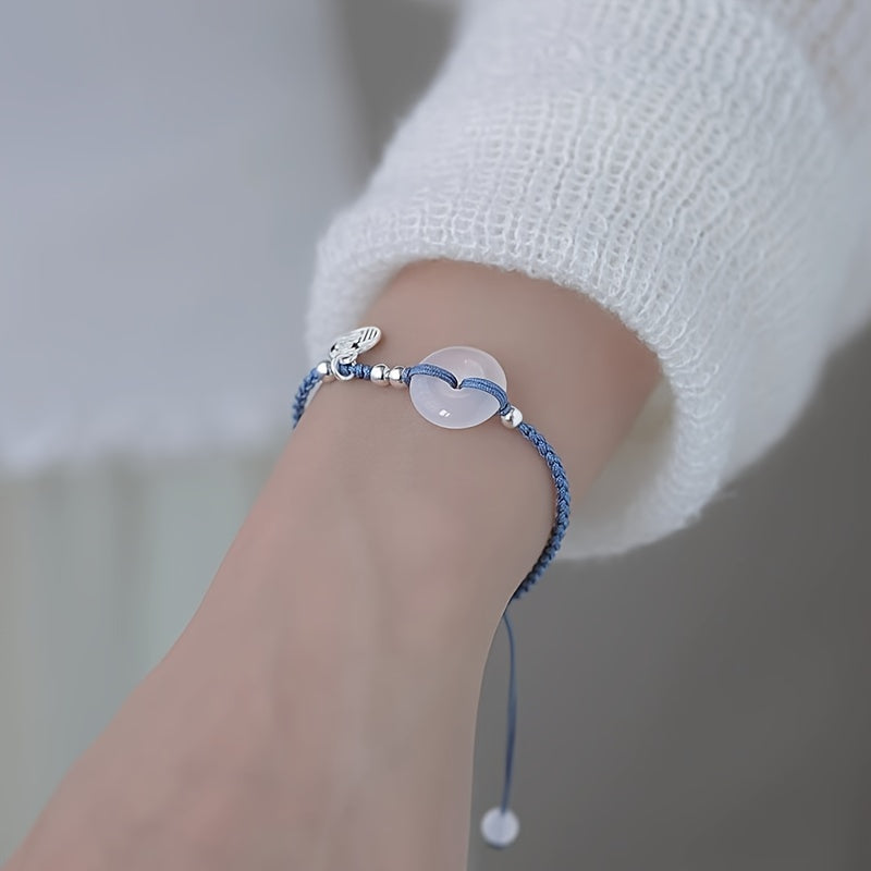 The glass beads provide a smooth, natural texture that complements the woven rope, while the silver accent adds a touch of sophistication. Together, they form a design that's perfect for daily wear or special occasions.