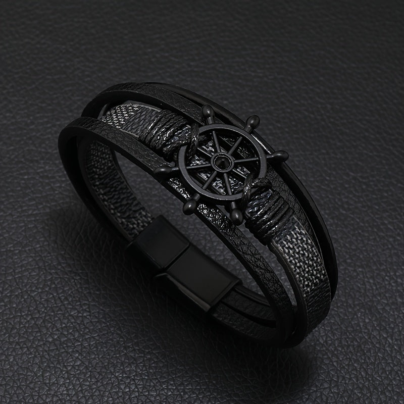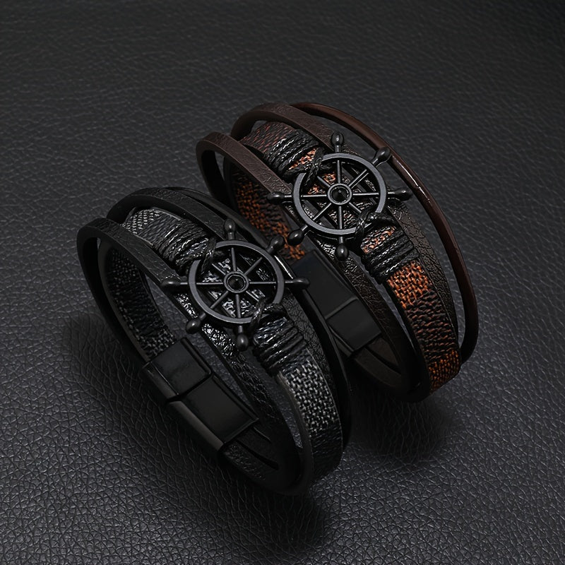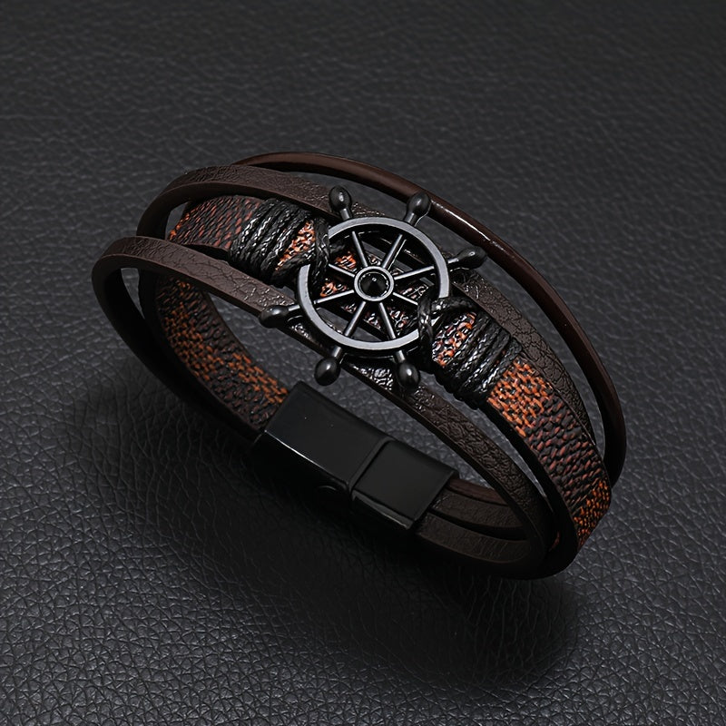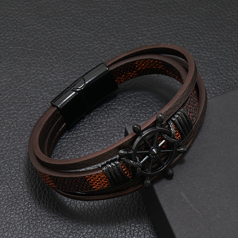 This retro men's fashion bracelet features a magnetic snap closure with rudder decoration in PU alloy finish. The combination of deep brown and black creates an elegant look perfect for daily wear or special occasions.