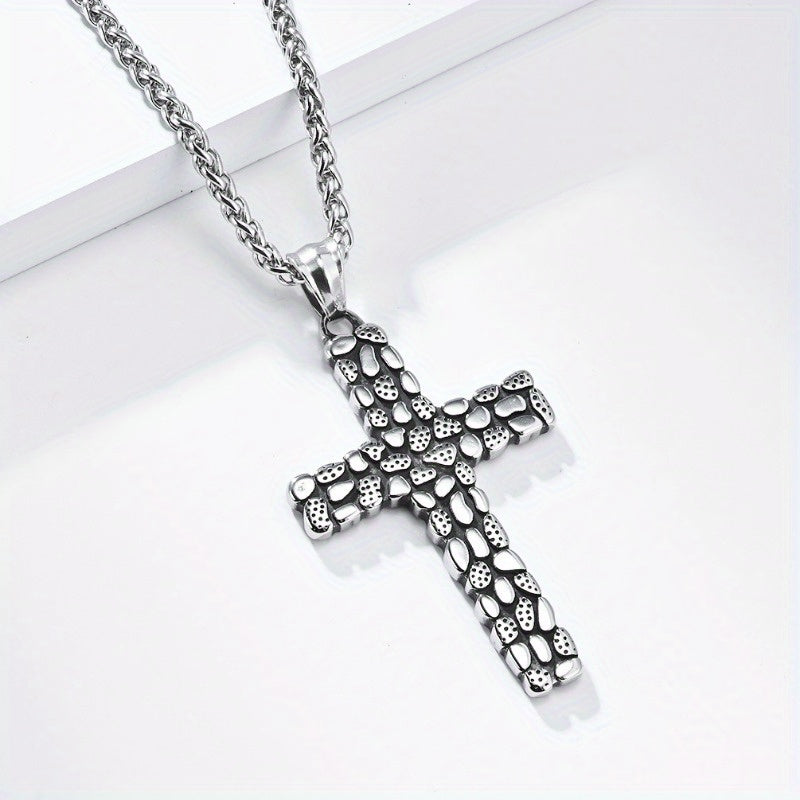 This Retro Pebble Titanium Stainless Steel Cross Necklace combines European and American vintage design with spiritual significance. The unique pebble-textured cross pendant is crafted from durable titanium steel, suspended on an adjustable 60cm stainless steel chain. This unisex necklace serves as a powerful talisman for spiritual protection, inner strength, and holistic wellbeing.