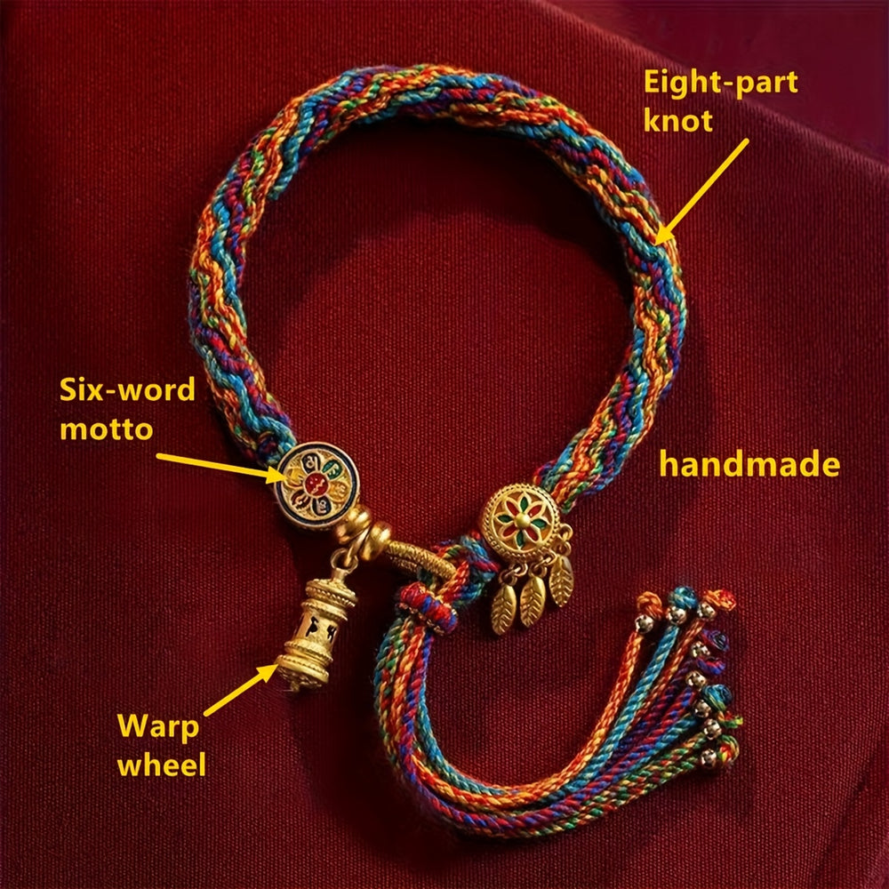 This Tibetan hand-woven bracelet features vibrant red, yellow, blue, and green nylon ropes with golden accents and ethnic charm. The combination of colors creates an eye-catching look perfect for daily wear or special occasions, embodying the essence of cultural symbolism jewelry.