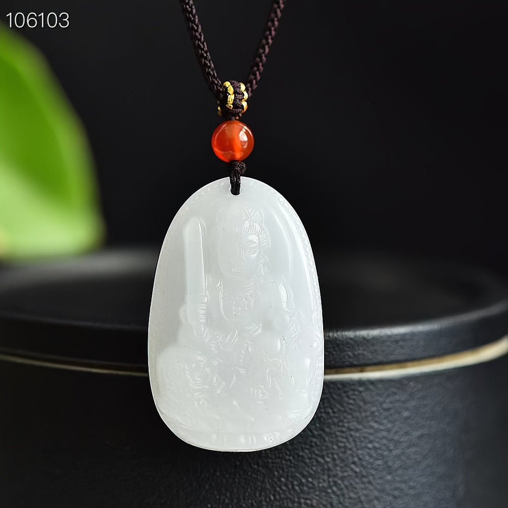 This Sacred Eight Immortals Protection Pendant is an exquisite piece of spiritual jewelry that combines ancient mythology with natural beauty. The centerpiece is a meticulously hand-carved figure of one of the Eight Immortals, legendary beings from Chinese folklore known for their magical powers and virtues. Carved from translucent natural stone, likely Xiuyan Jade, the pendant is a powerful talisman for protection, good fortune, and peace.