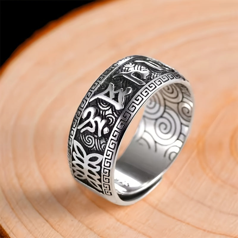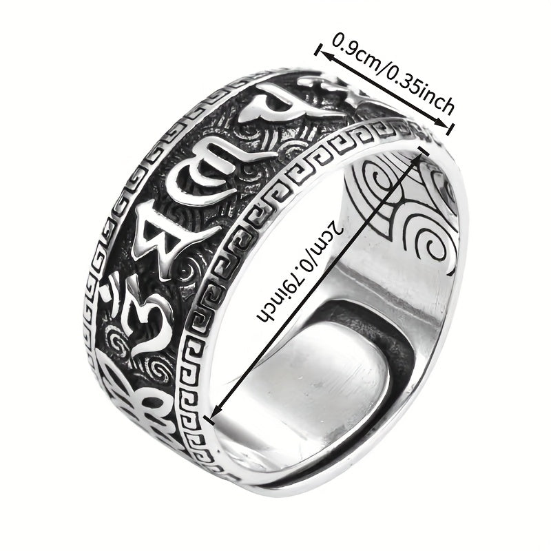 This vintage silvery-plated wide band ring features ancient Sanskrit mantra engravings believed to attract wealth and provide spiritual protection. The adjustable unisex design makes it perfect for daily wear or special spiritual occasions. Measuring 2cm/0.79inch in width and 0.9cm/0.35inch in thickness, this ring serves as a powerful talisman for prosperity and spiritual well-being.