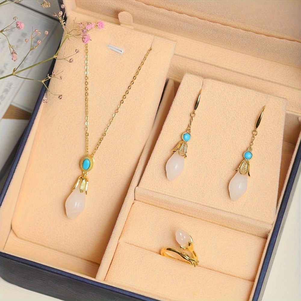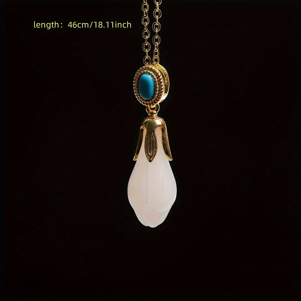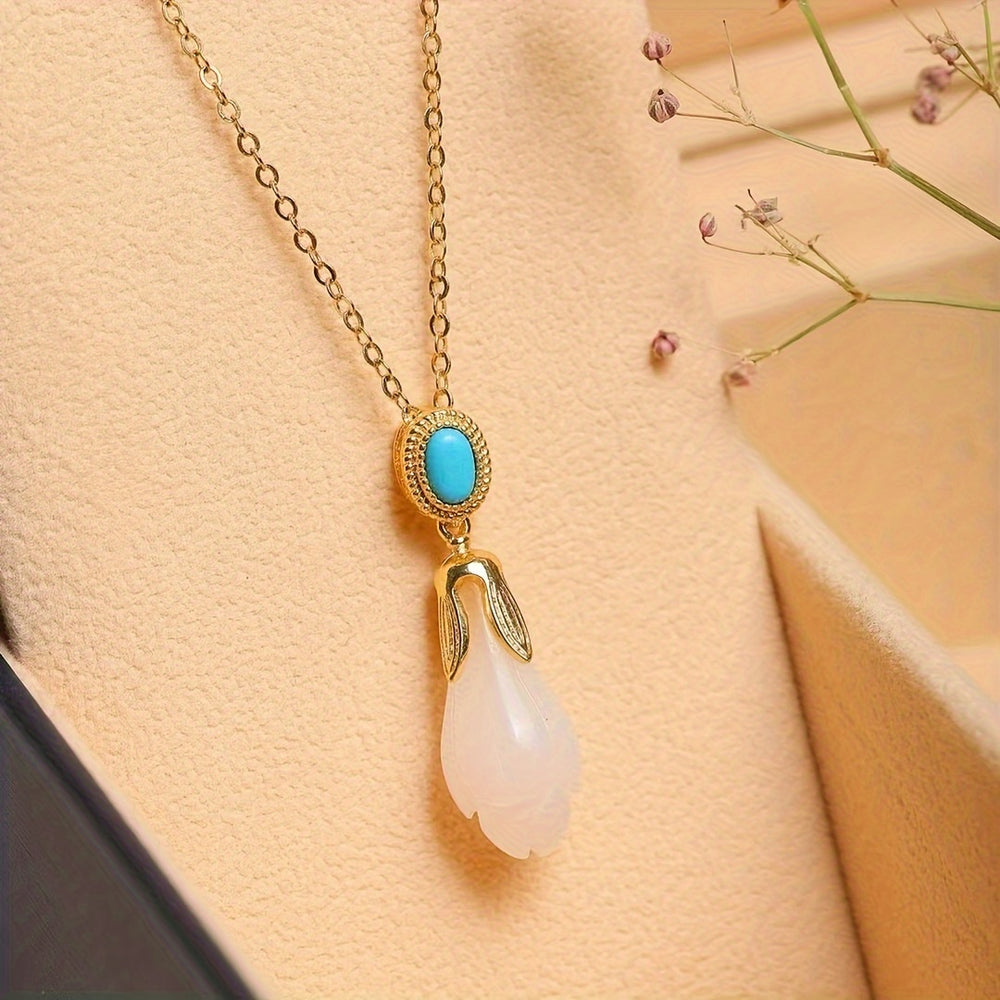Embrace timeless elegance and profound symbolism with our Elegant Style Natural Stone Single Ring. This exquisite piece is a masterpiece of natural beauty and craftsmanship, designed to bring grace and positive energy into your life. It features a delicately hand-carved sheep fat white jade orchid, a symbol of purity and beauty, accented by a vibrant turquoise stone set in a durable, un-plated gold-tone frame.