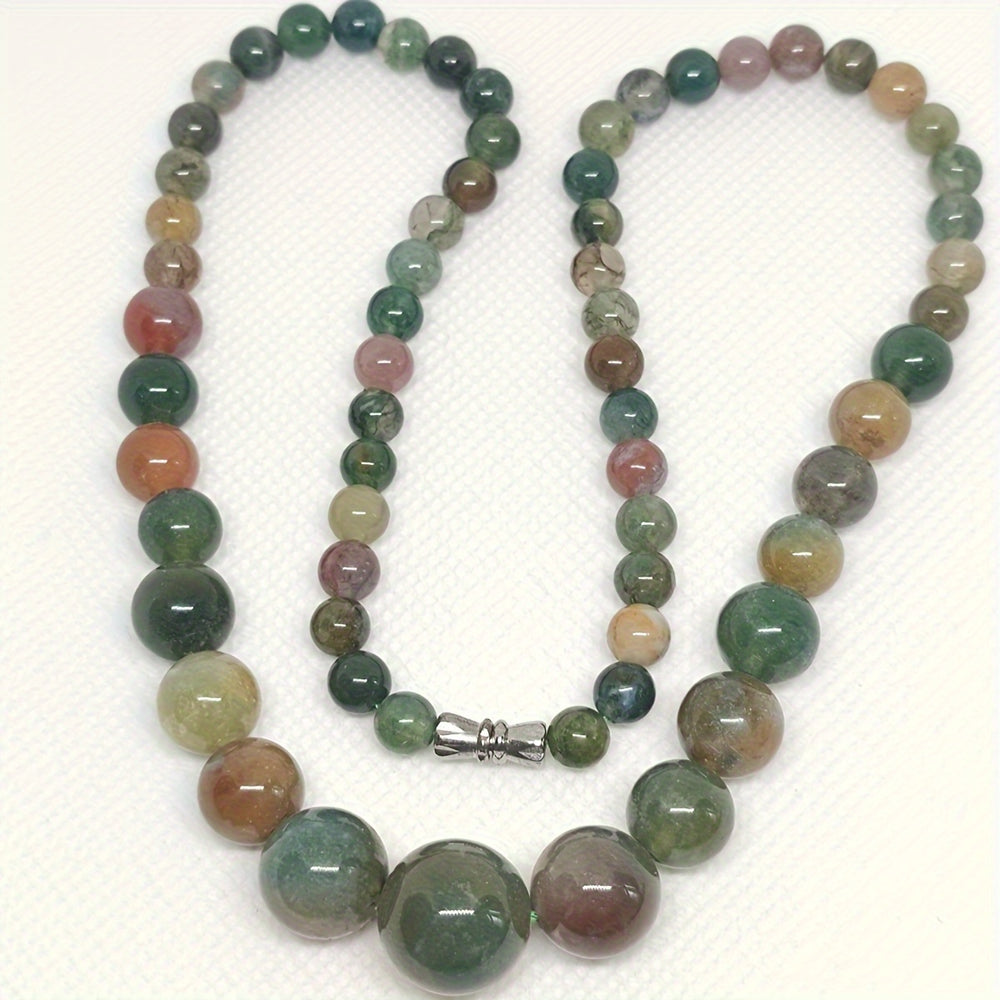 This necklace is crafted from natural agate stones, a variety of chalcedony known for its vibrant colors and unique banding patterns. Agate is a semi-precious stone that has been used for centuries in jewelry and spiritual practices. The beads are left unplated to preserve their natural beauty and energetic properties. The necklace features a graduated design with beads in sizes ranging from 6mm to 14mm, strung together to create a harmonious and elegant piece. The clasp is made of durable metal alloy, ensuring the necklace is secure and long-lasting.
