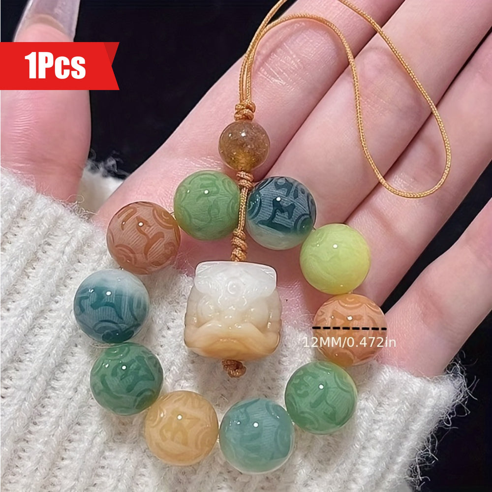 This handcrafted charm features multicolored mantra beads—shades of jade-green, teal, celadon, warm honey and soft lemon—circling a two-tone carved Pixiu (the Chinese wealth-guardian). Designed as an indoor decorative hanging, mobile phone lanyard, keychain pendant, or purse/bag accessory, it channels the Six-Word Mantra (Om Mani Padme Hum) to cultivate compassion, calm the heart, and attract auspicious opportunities.