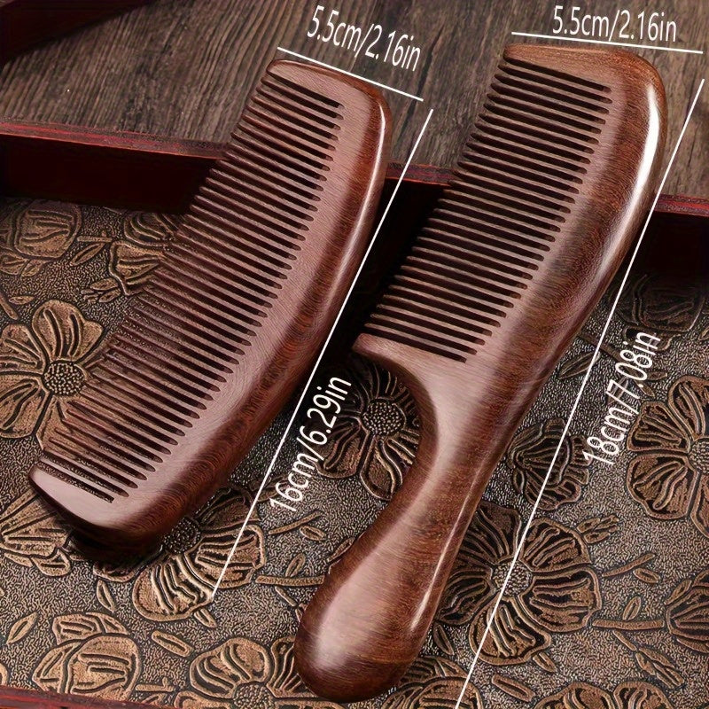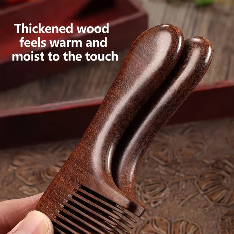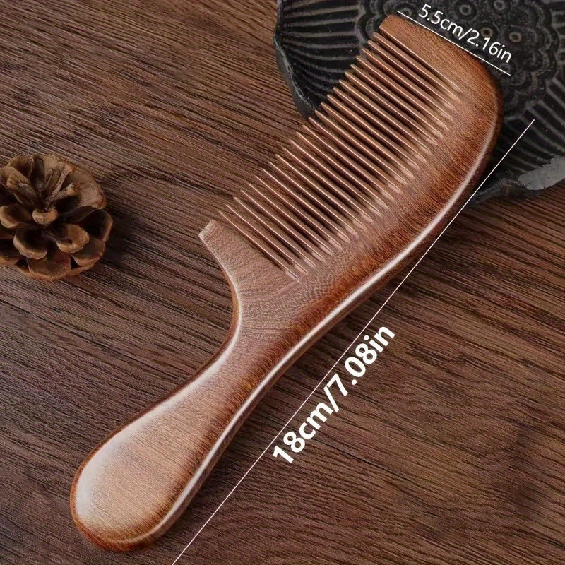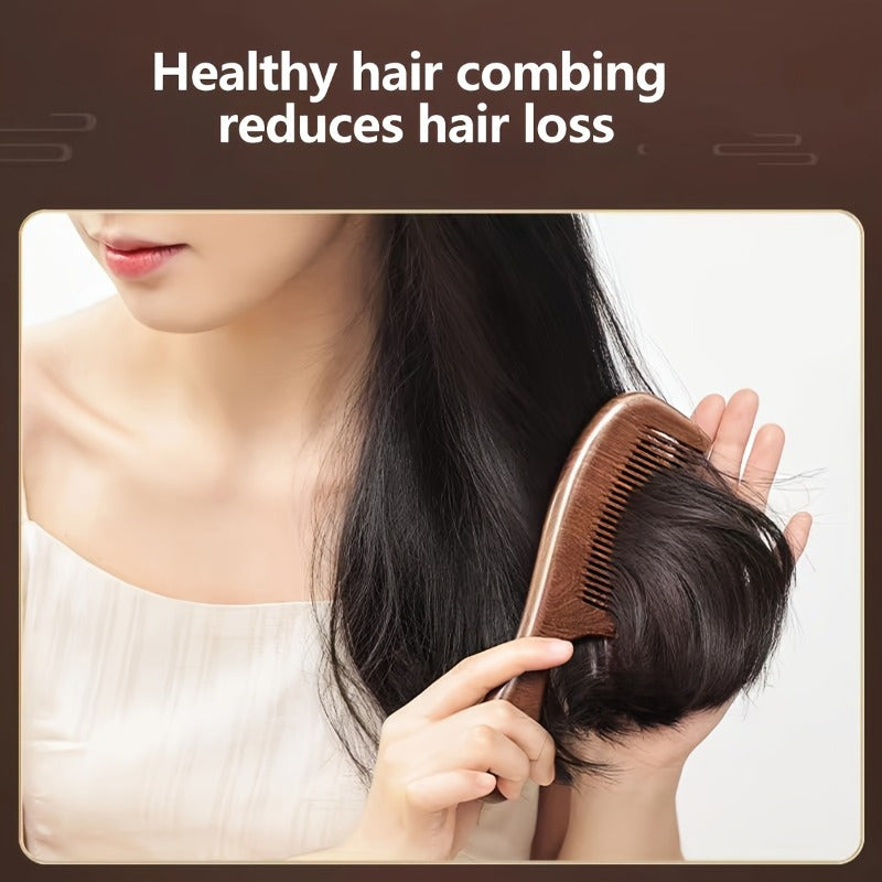 This solid wood sandalwood comb features a unique crescent design with an ergonomic long handle for comfortable daily use. The natural wood material provides gentle scalp stimulation and promotes healthy hair growth while the deep brown color adds a touch of natural elegance.
