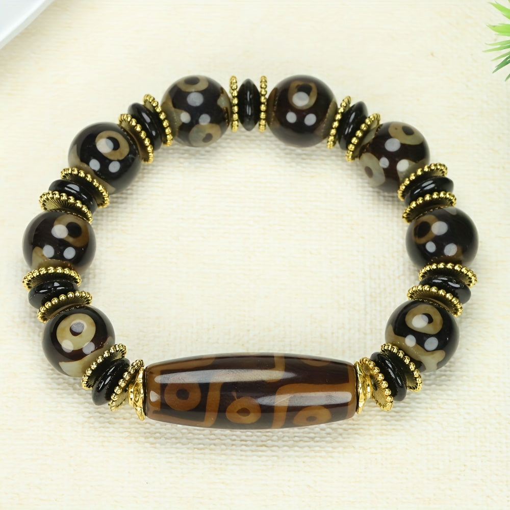 Embrace the mystical allure of ancient spirituality with our Bohemian Three-Eyed Dzi Agate Bracelet. This stunning piece features a curated selection of natural agate beads, celebrated for their grounding and protective properties, accented with elegant golden-tone spacers. Designed in a free-spirited bohemian style, it's a versatile unisex accessory that seamlessly blends earthy aesthetics with profound energetic benefits.