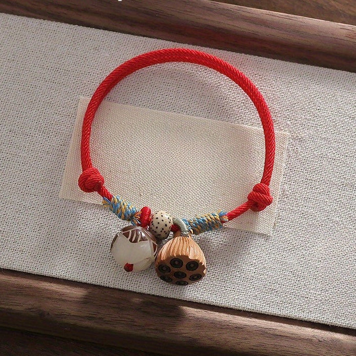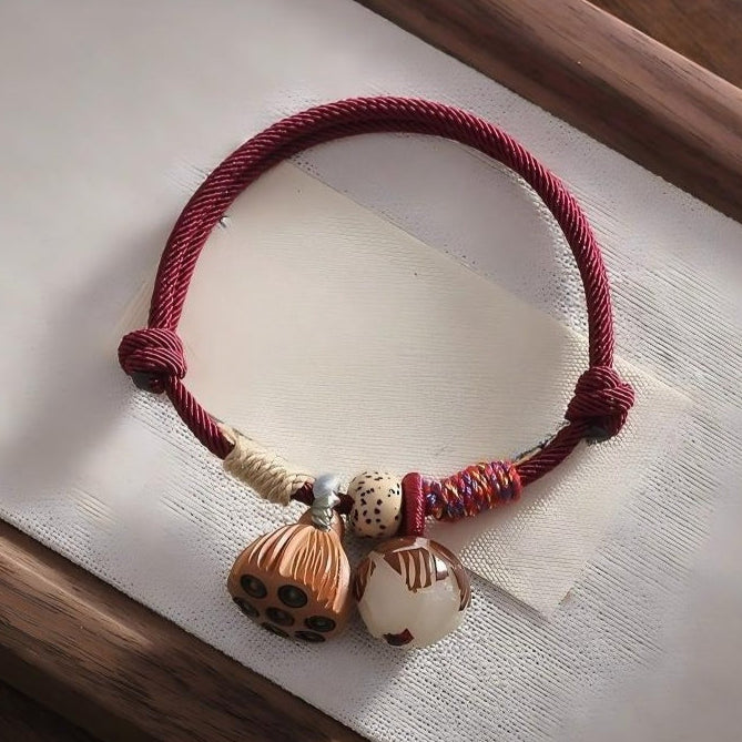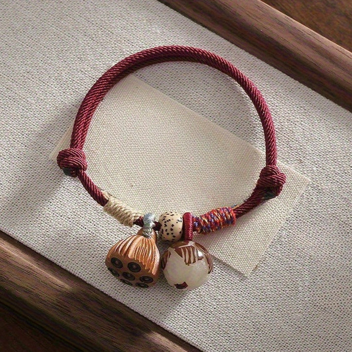 Crafted from durable wine-red woven rope and smooth white beads, this bracelet necklace combines natural materials with refined craftsmanship. The rope provides a traditional texture, while the beads add a touch of elegance.