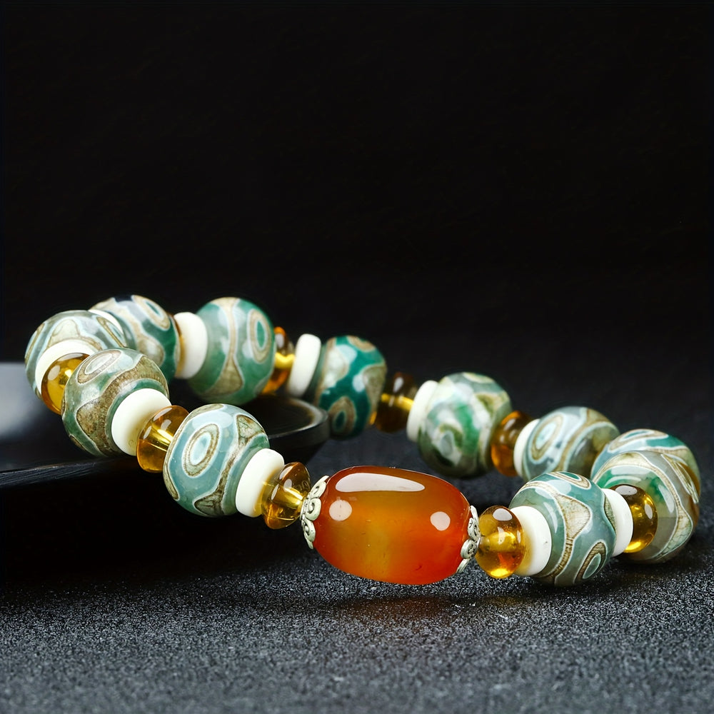 Embark on a journey of spiritual wellness with our Tibetan Three-Eye Dzi Bead Bracelet. This exquisite unisex rosary is meticulously crafted from natural agate, featuring sacred Three-Eye Dzi beads known for their profound protective and harmonizing energies. The design is accentuated by a striking amber-colored bead, creamy white spacers, and elegant silver-toned details, creating a piece that is both a powerful energetic tool and a statement of retro ethnic style.