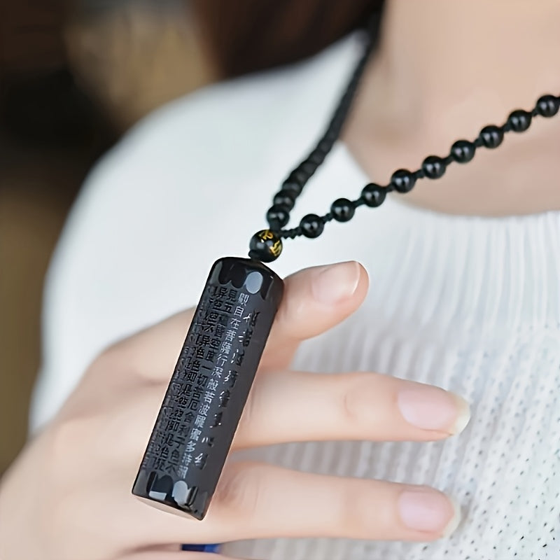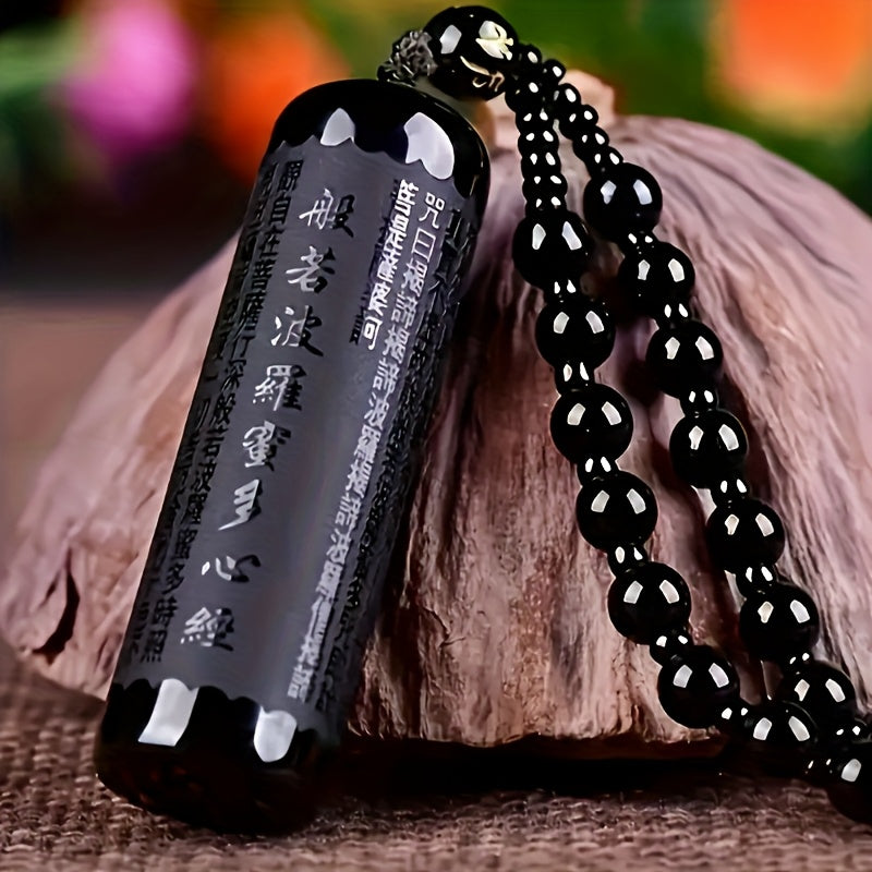 The Heart Sutra engraving represents the path to wisdom and non-attachment in Buddhist tradition, while the vibrant green jade symbolizes renewal, growth, and heart-centered energy. Together, they create a protective symbolism that supports both spiritual protection and emotional healing. The alternating black and green bead chain embodies the balance between grounding (black) and vitality (green), making this pendant a powerful tool for mindful living practices.
