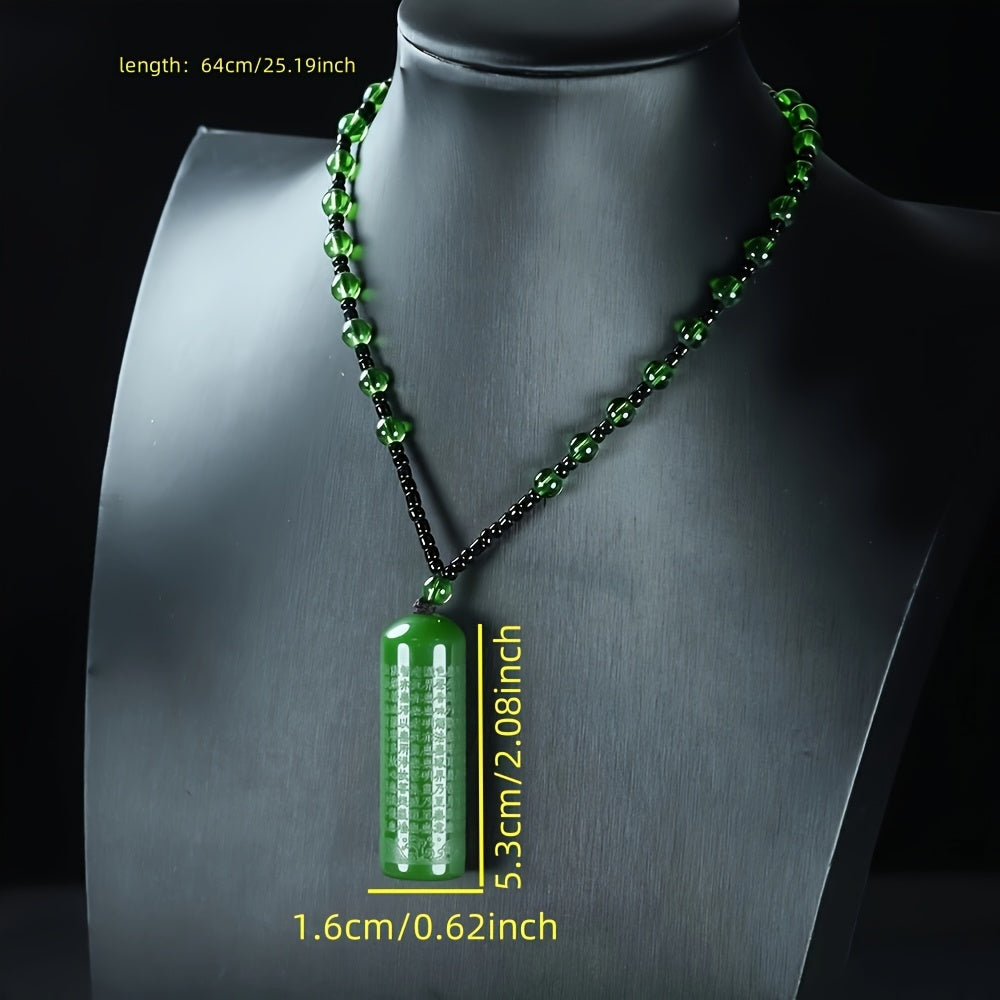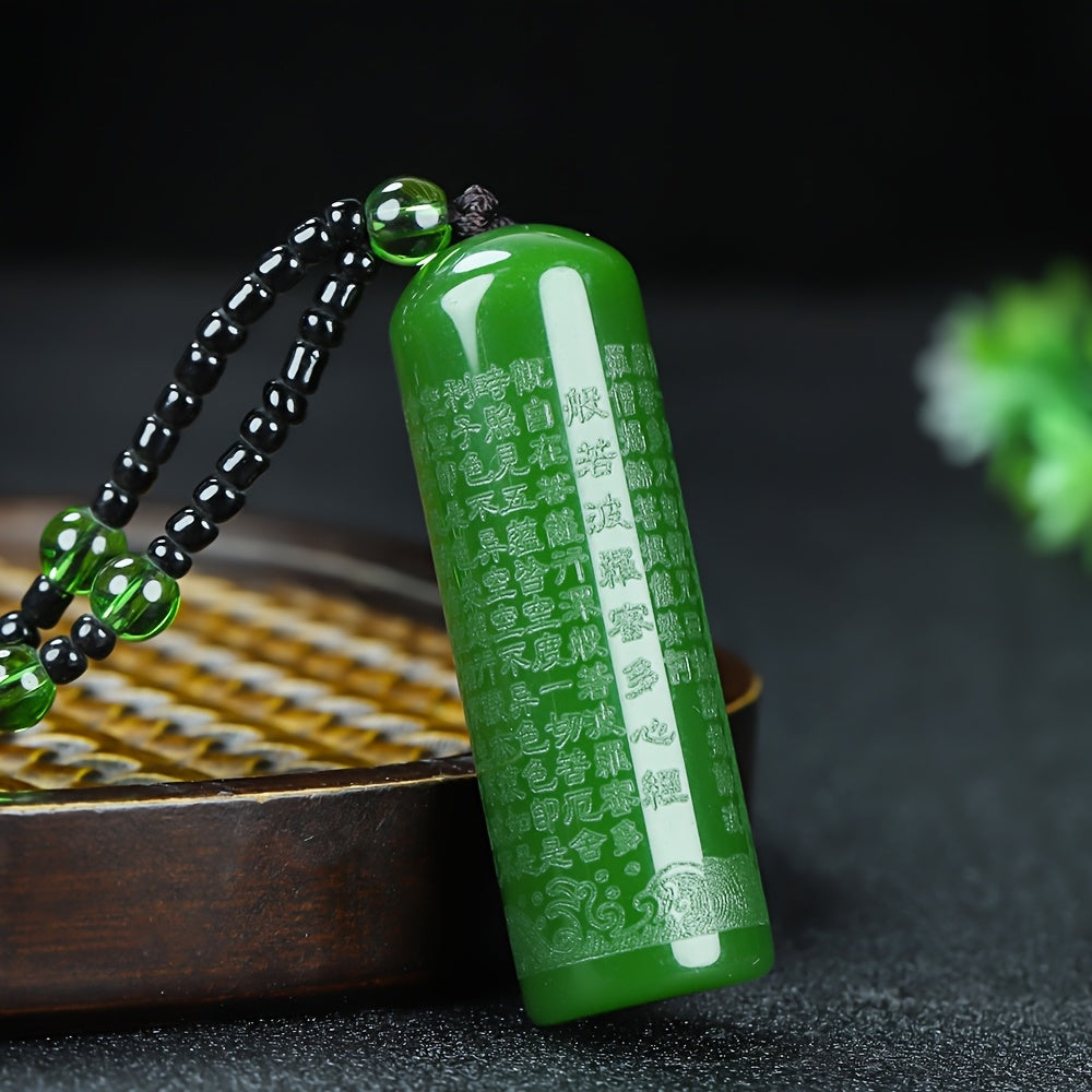 The vibrant green pendant necklace features a premium jade pendant with intricate Heart Sutra engraving. This unisex casual jewelry combines Eastern-inspired serene design with smooth texture for comfortable daily wear. The alternating black and green beaded chain enhances its natural stone spiritual accessory appeal.