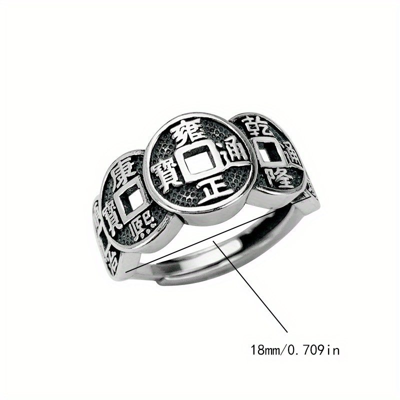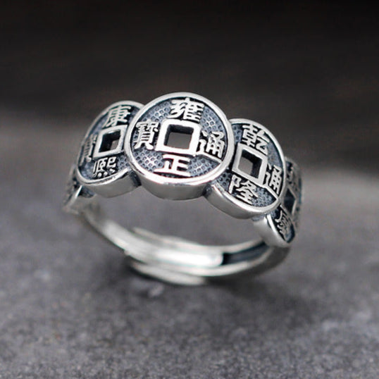 This antique silver ring features a unique design with five emperors coins embedded in oxidized zinc alloy, symbolizing wealth, protection, and balance through Feng Shui principles. The ring is designed to attract positive energy and enhance spiritual connection while serving as a stylish accessory.