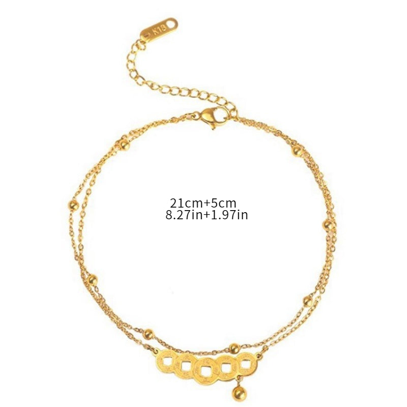 The copper coin pendant represents prosperity and good fortune in many Asian cultures, while the double-layer chain adds elegance and movement. The adjustable design ensures a comfortable fit for all ankle sizes.