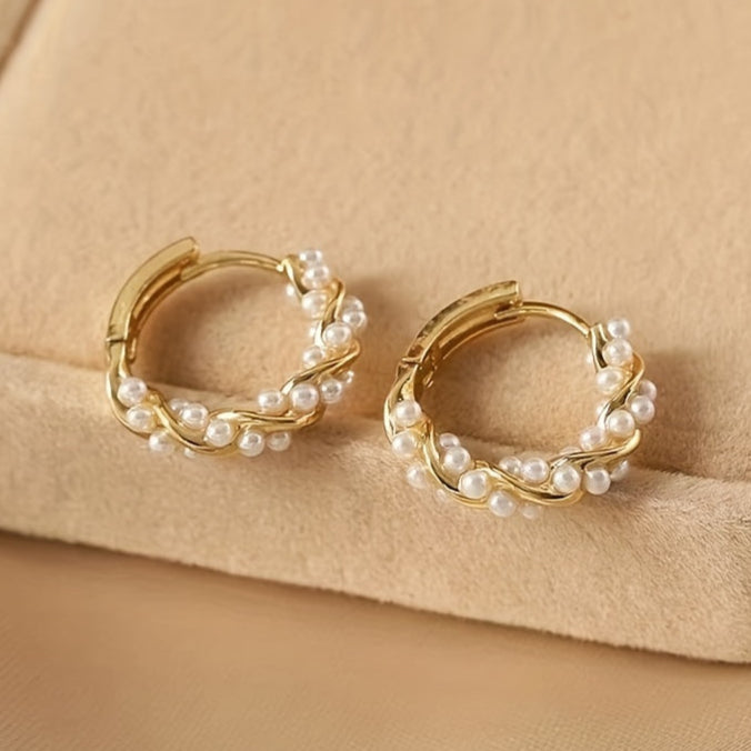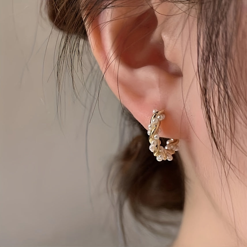 This vintage-inspired hoop earrings feature copper-toned alloy with imitation pearl accents, creating a harmonious blend of boho chic and earthy elegance. The design embodies natural harmony while symbolizing connection to nature and positive energy through its pearl-like composition and metallic details.