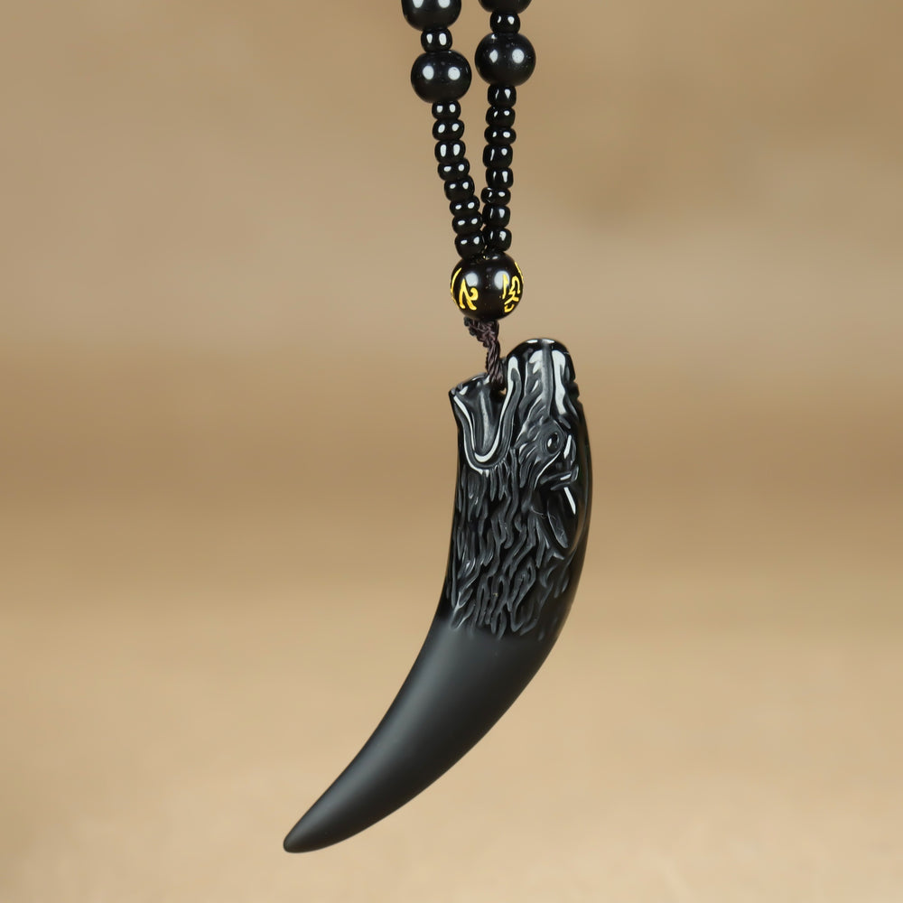 This vintage boho necklace features a wolf tooth pendant carved from icy black obsidian, paired with black stone beads and a golden symbol accent. The earthy brown hue represents stability, grounding, and connection to nature, while the black beads add a touch of mystery and strength.