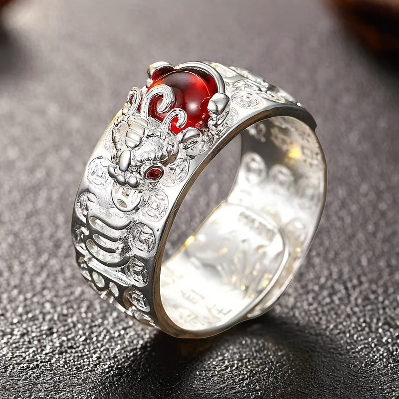 The Pixiu symbol represents wealth attraction and protection, while the dragon carvings symbolize power and good fortune. The red gemstones enhance the ring's energetic properties and add a touch of elegance.