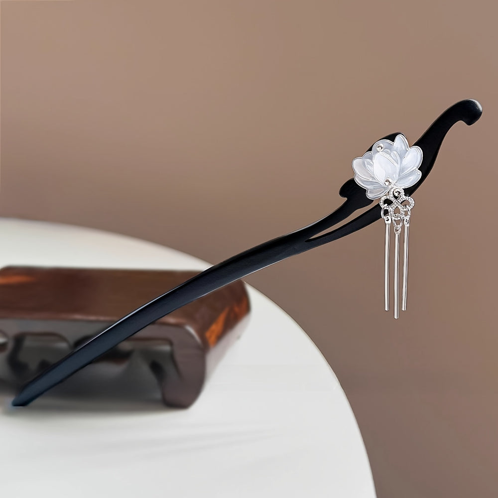This vintage floral hairpin features an elegant wooden design with silver tassels. The combination of black wood, white jade-like flowers, and silver accents creates an elegant accessory perfect for fairy-tale inspired hairstyles and formal events.