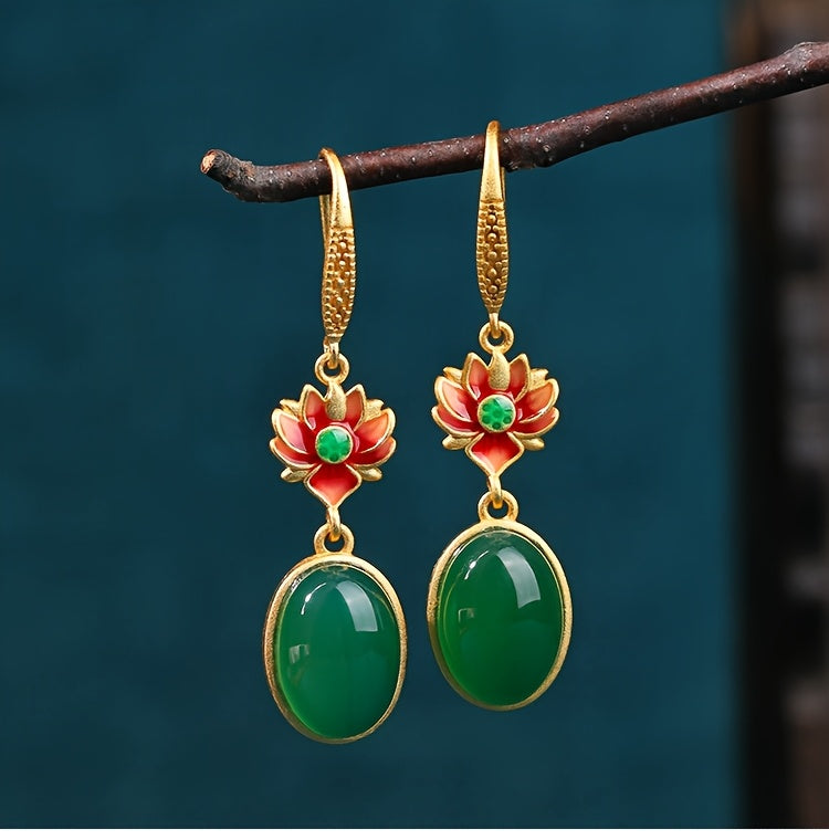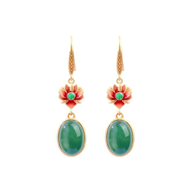 The green jade teardrops enhance heart chakra balance, while the red enamel details provide protective energy. The long chain pendants add movement and grace, perfect for vacation wear.
