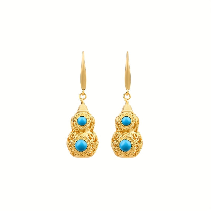 The gourd motif represents abundance, fertility, and protection in many cultures, while the turquoise stones symbolize emotional healing, clear communication, and throat chakra balance. Gold plating amplifies positive energy, making them both fashion accessories and prosperity talismans.