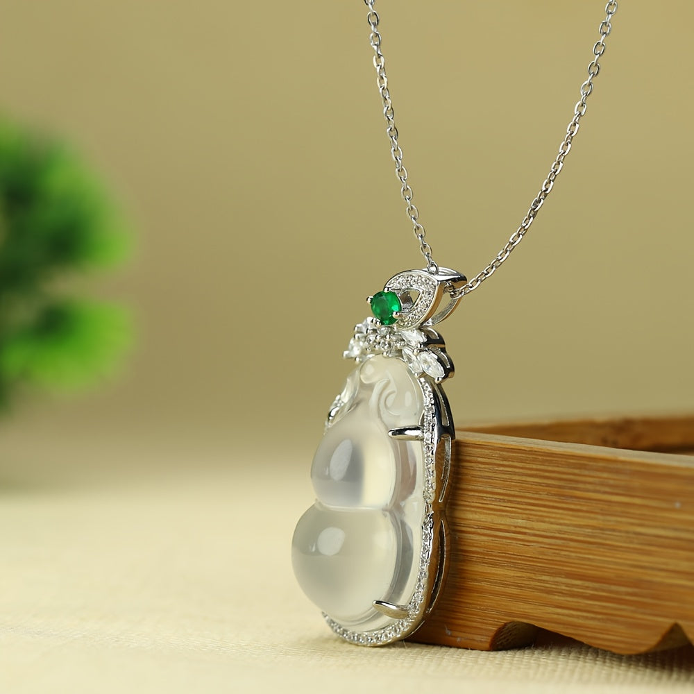 Embrace timeless elegance and profound symbolism with our Vintage Gourd-Shaped White Agate Pendant Necklace. This exquisite piece features a beautifully carved white agate stone in the shape of a gourd, a powerful symbol of good fortune and longevity. It is lavishly accented with a vibrant green stone and a halo of brilliant cubic zirconia rhinestones, creating a stunning and meaningful accessory.