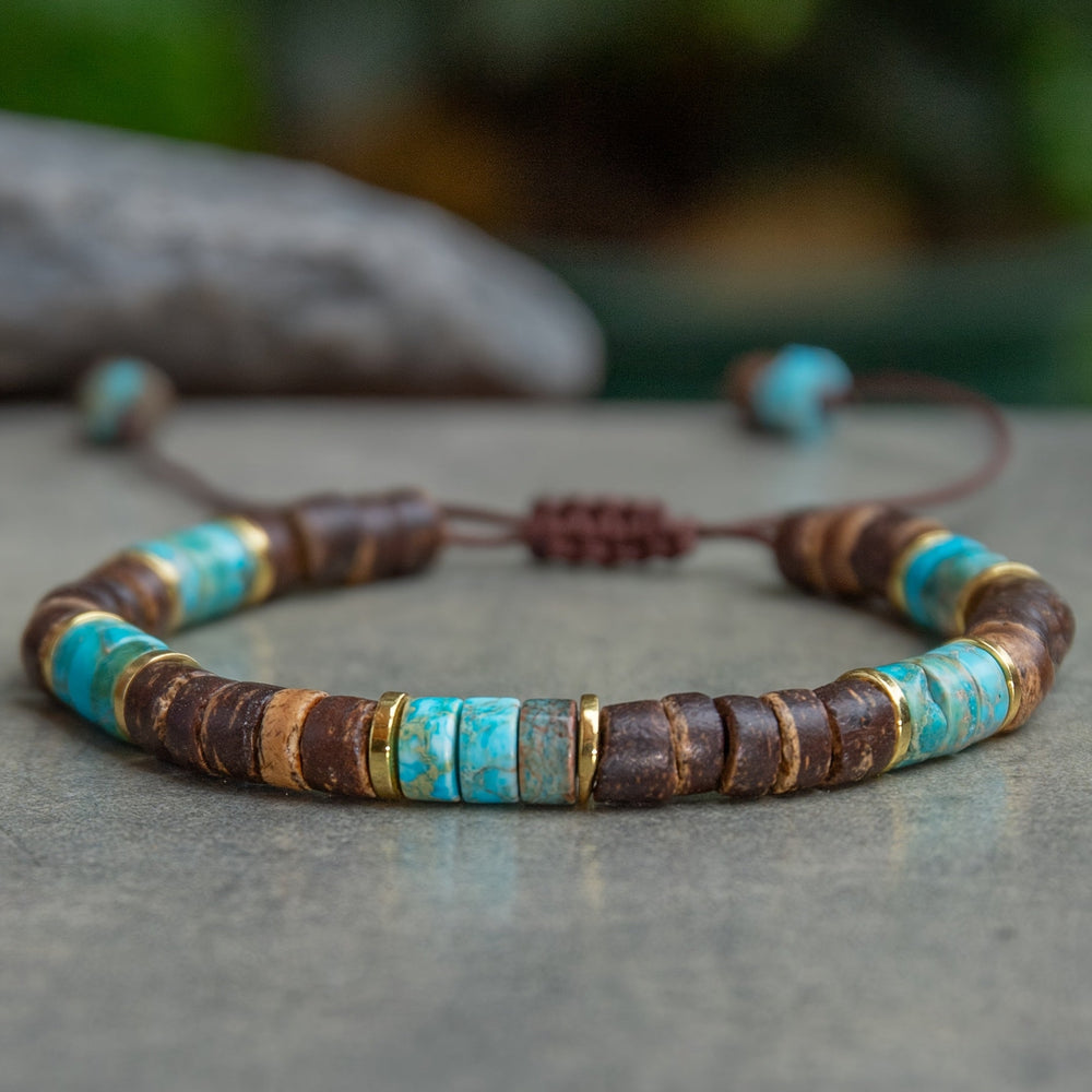 This vintage imperial stone bracelet features natural brown and turquoise beads with golden accents in a handcrafted design. Each element is chosen to promote grounding energy and emotional balance.