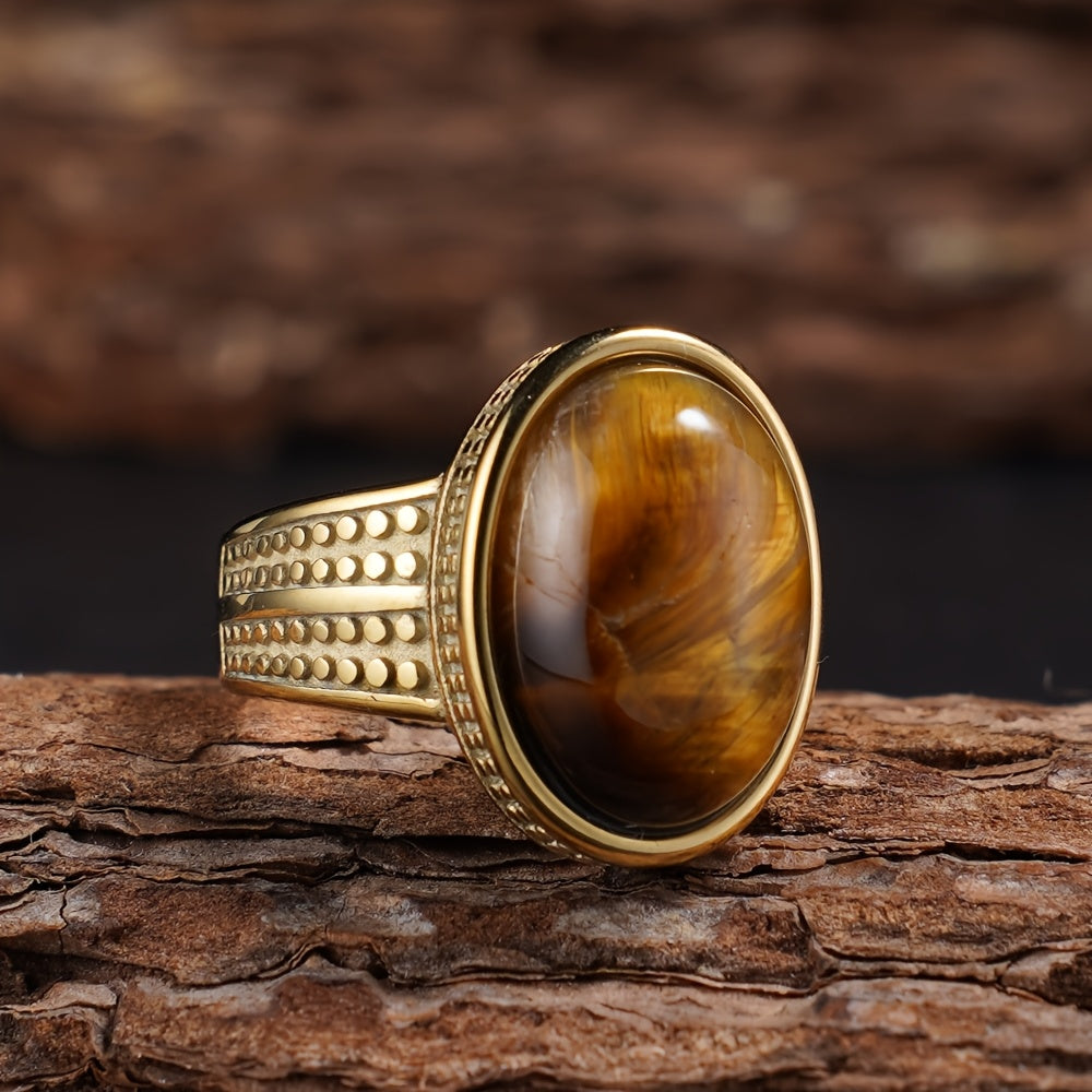 Elevate your style and spirit with our Vintage-Inspired 316L Stainless Steel Elliptical Ring. This timeless piece features an elliptical setting with hand-set tiger's eye (brown) and turquoise (blue) stones, accented by black onyx. The 18K gold-plated band adds a touch of luxury, while the vintage design pays homage to classic jewelry. Designed for unisex wear, it’s perfect for casual attire or spiritual practices.