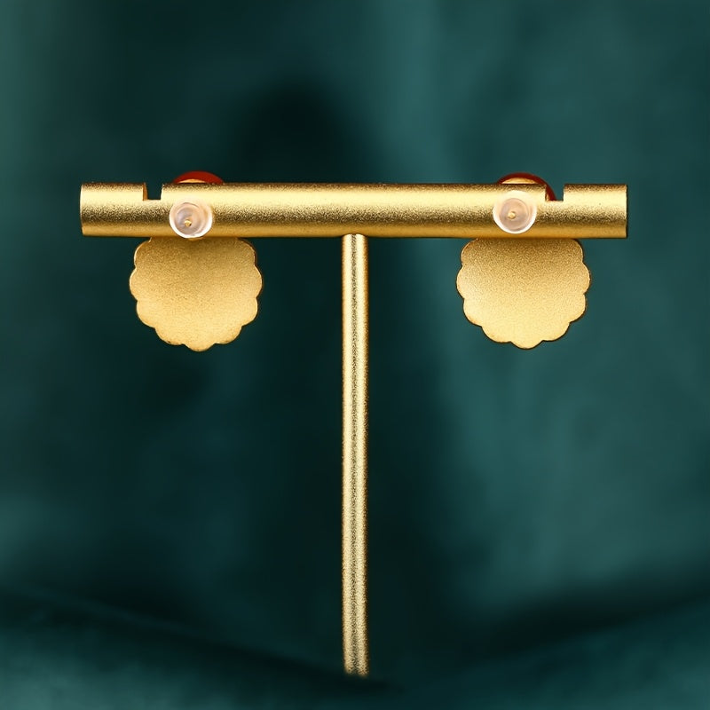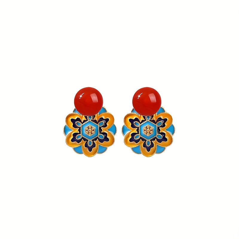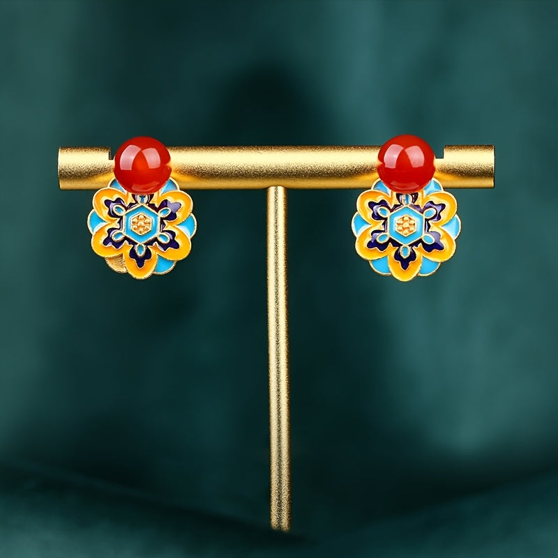 These vintage Islamic geometric earrings feature a striking blue and yellow enamel design with a red core jade accent. The 24K golden plated finish and 925 sterling silver posts ensure both elegance and comfort for daily wear.