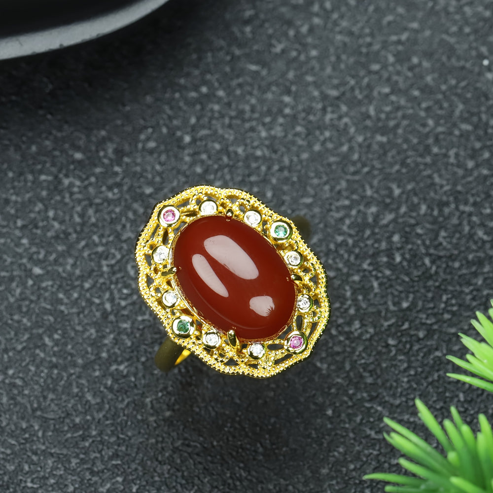 The ring's deep red agate hue and vintage-inspired details capture the essence of luxury and vitality. The adjustable "live ring" style ensures a comfortable, perfect fit, while the gold-plated setting adds a touch of opulence. This ring is more than jewelry; it's a wearable talisman for prosperity and a bold expression of timeless style.