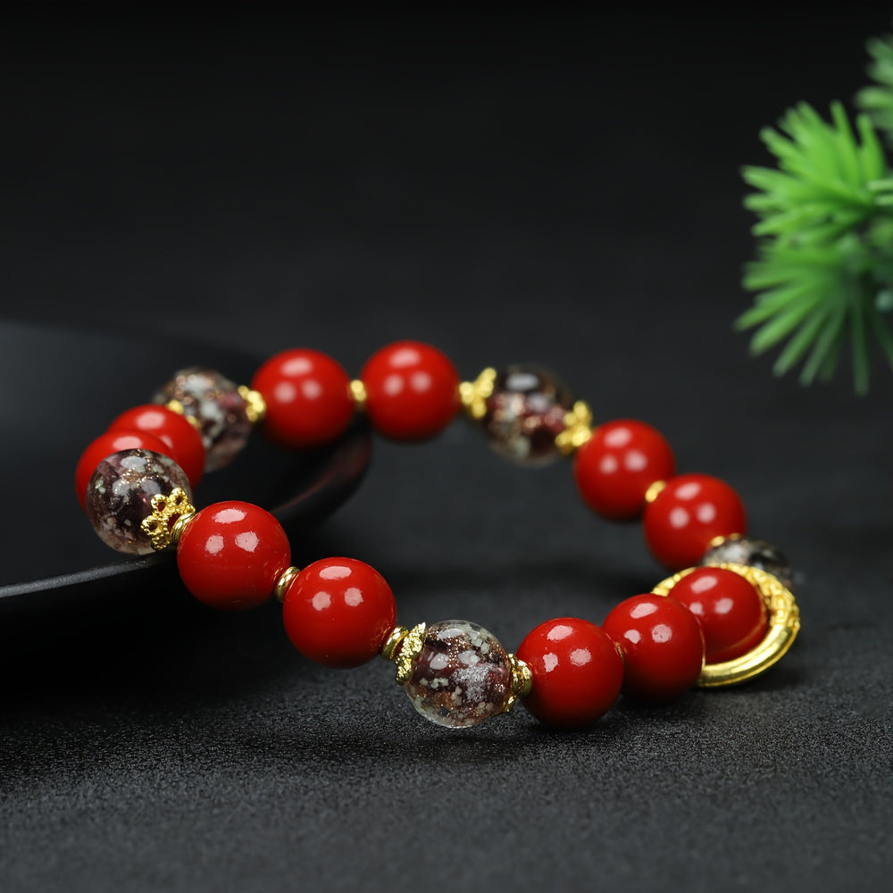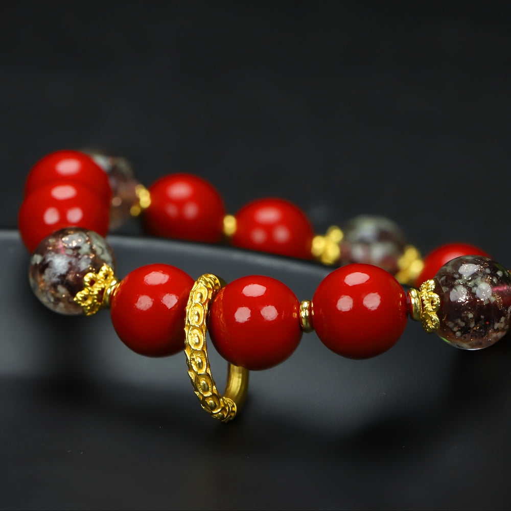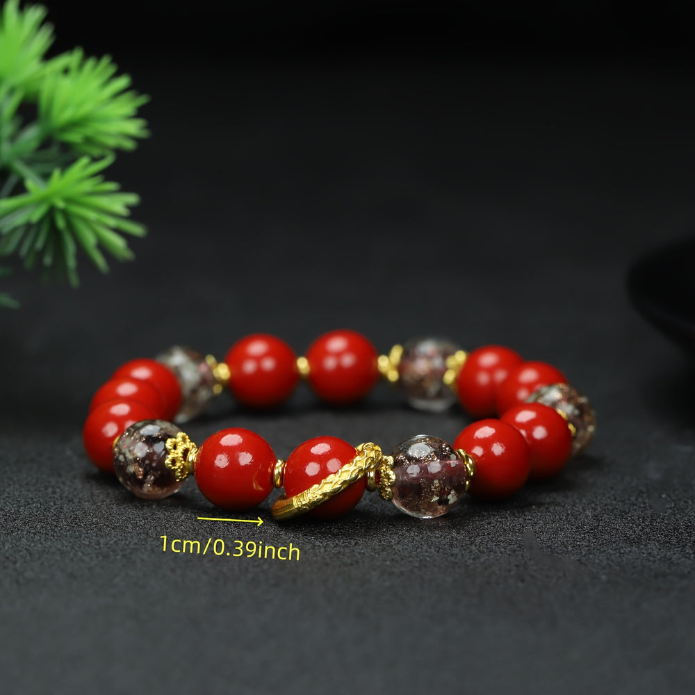 Embrace a timeless piece of cultural elegance and powerful symbolism with our Vintage Red Bead & Golden Spacer Bracelet. This exquisite accessory is meticulously crafted with vibrant red beads, believed to be a powerful magnet for good fortune and protection. Accented with gleaming golden-tone spacers and a unique "Ink Stone" bead, it represents a fusion of ancient tradition and modern spiritual style.