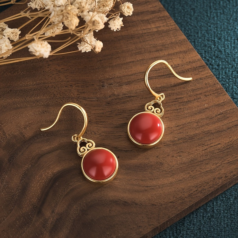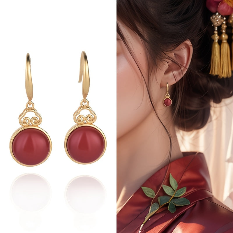 These vintage-style ruby dangle earrings feature an auspicious cloud design with faux jade inlay in a golden-tone copper setting. Perfect for Hanfu or casual attire, they blend spiritual energy and prosperity symbolism through their elegant craftsmanship and meaningful design elements.