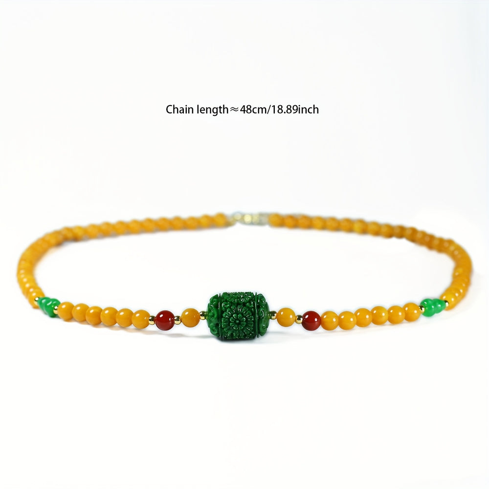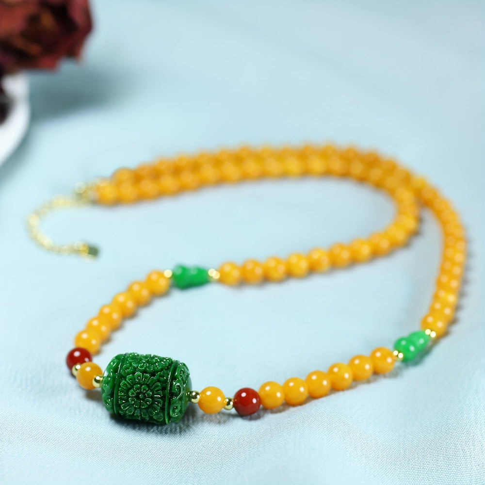 This vintage wax necklace features an agate pendant with yellow, green, and red beads on a white background. The combination of vibrant colors creates an elegant look perfect for daily wear jewelry or special occasions.