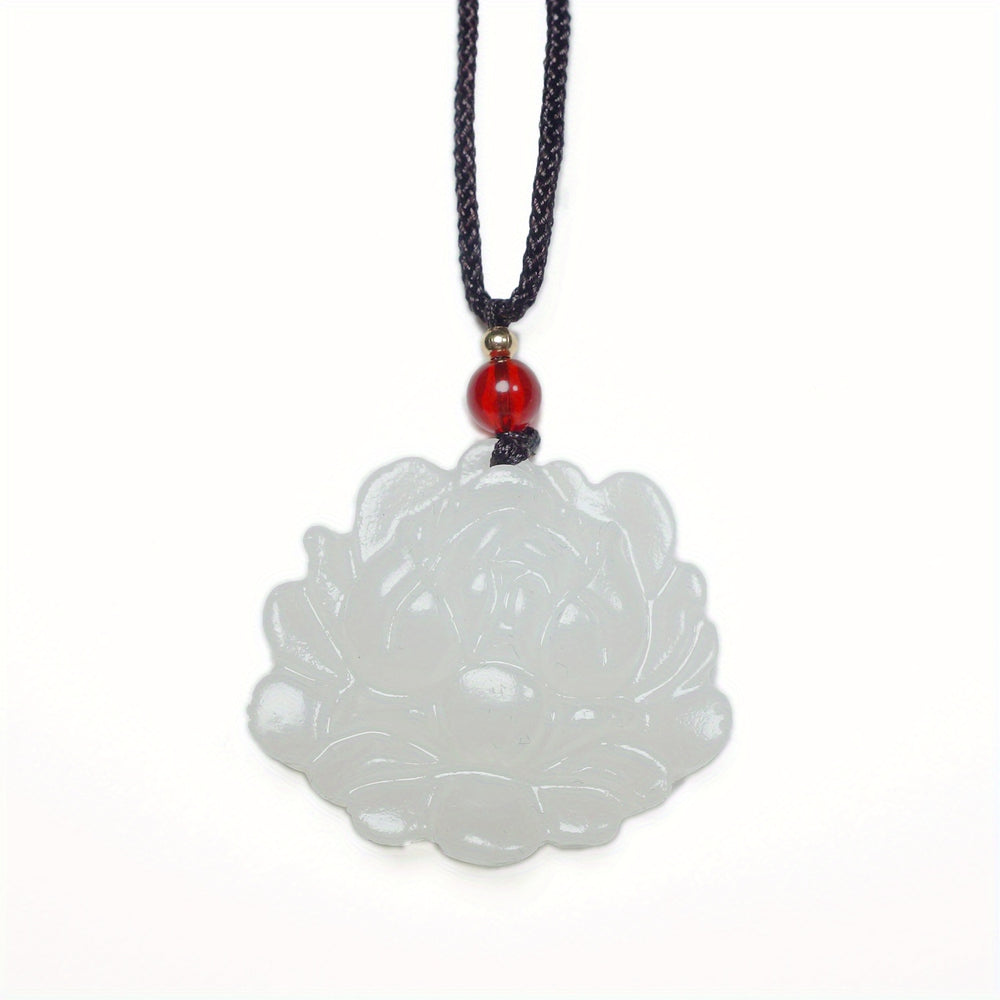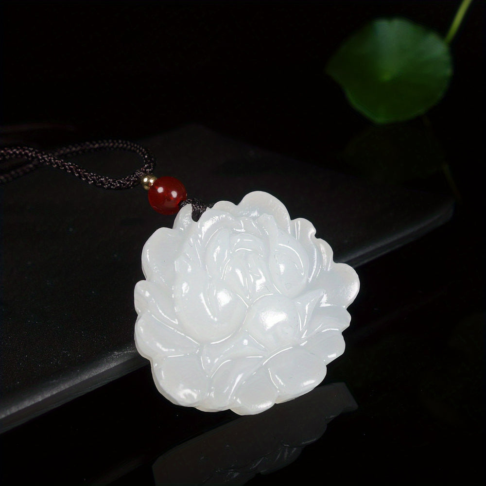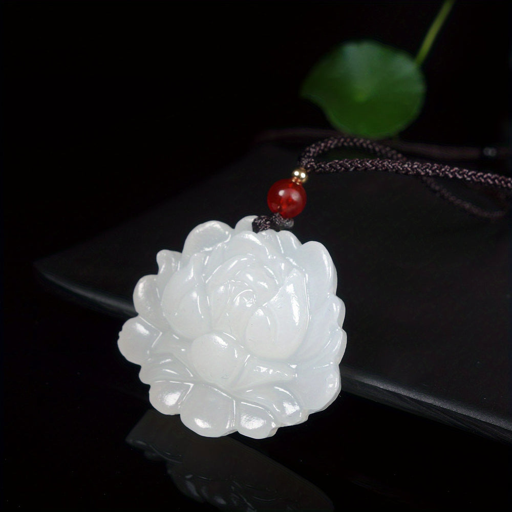 This white flower natural stone pendant features a vintage artistic design with white/light-colored stone, deep red accents, and a 60cm chain. The combination of elegant design and spiritual symbolism makes it perfect for daily wear jewelry or special occasions.