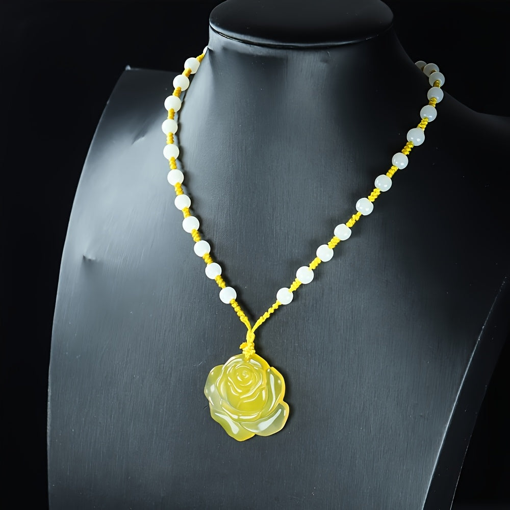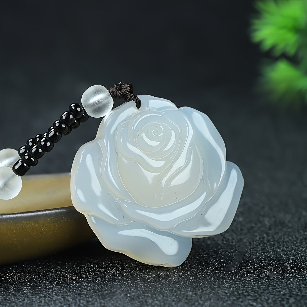 Embrace the timeless elegance of love and purity with this exquisite White Jade Rose Pendant Necklace. Known as "Colorful Ice" for its stunning translucency, this necklace features a beautifully hand-carved rose pendant, symbolizing affection, beauty, and new beginnings. Strung on a long, 64cm cord of polished black beads with a gold-colored accent, it offers versatile styling for any occasion.