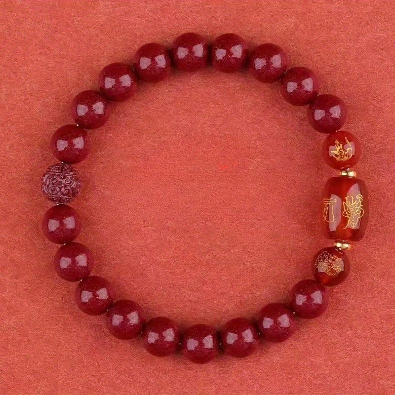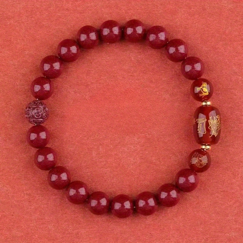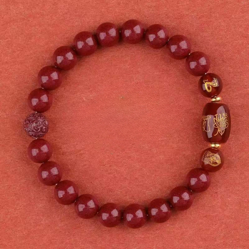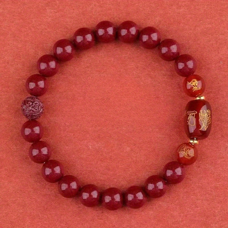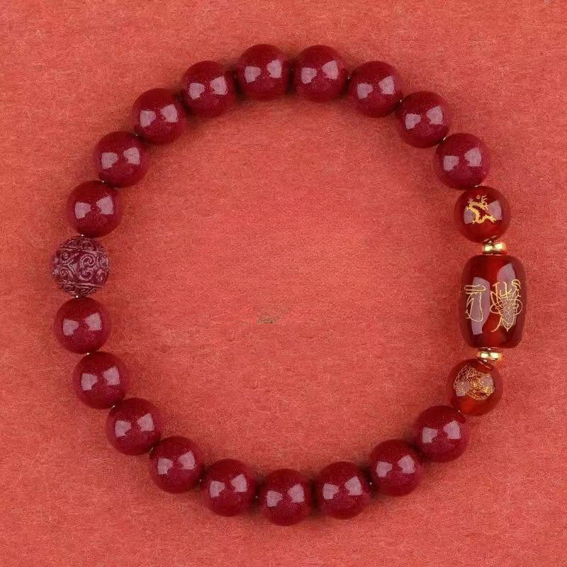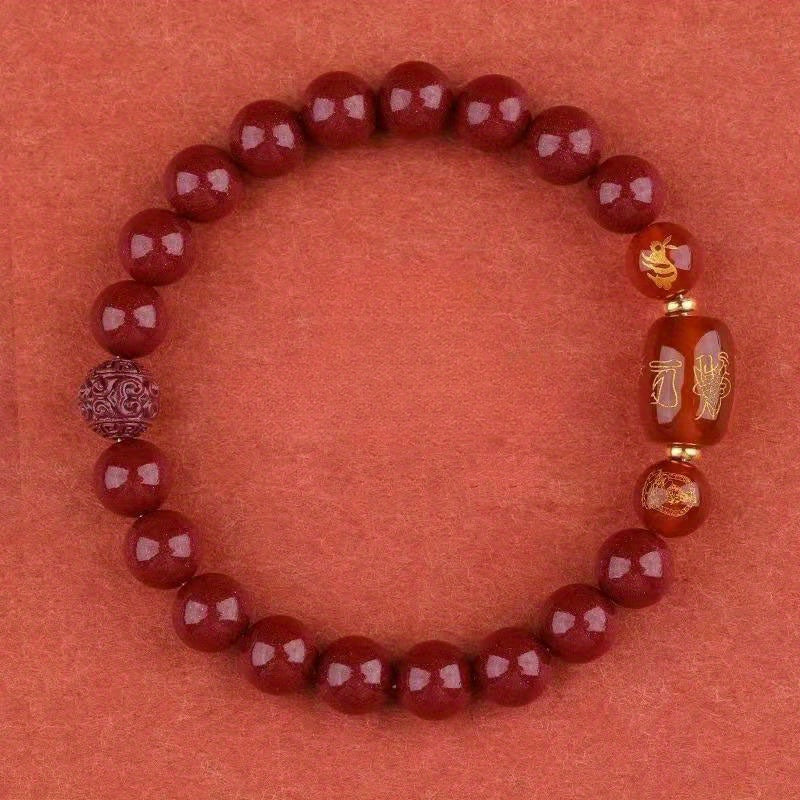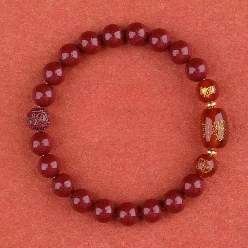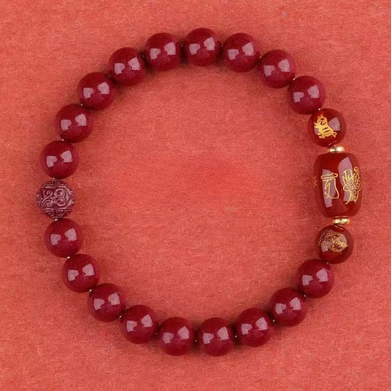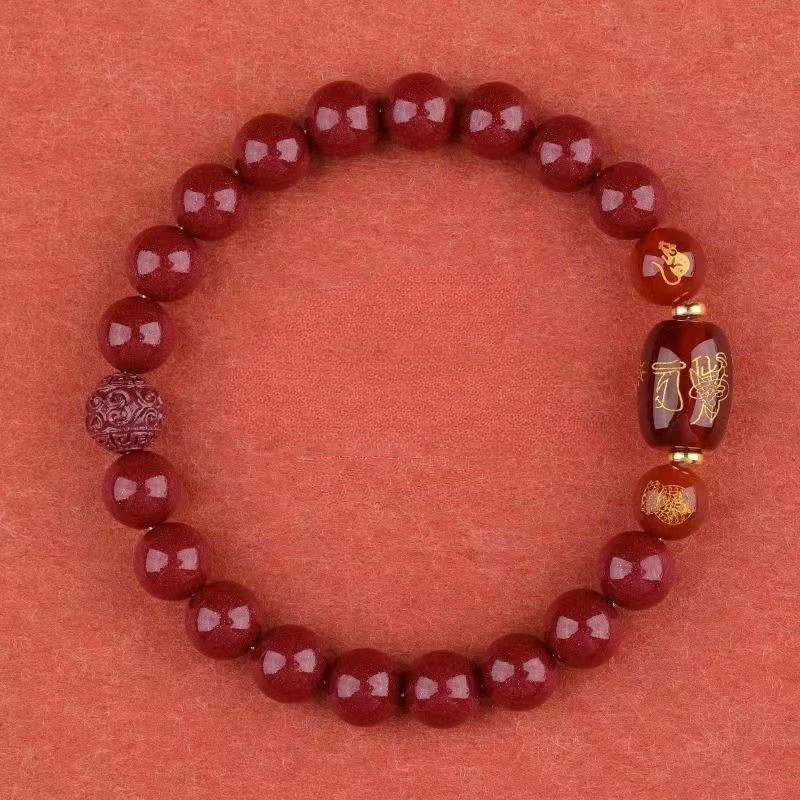 The cinnabar beads represent vitality and protection in Chinese culture, while the golden zodiac charms symbolize specific virtues - rabbit for gentleness, rat for wisdom, dragon for power, horse for freedom, and rooster for diligence.